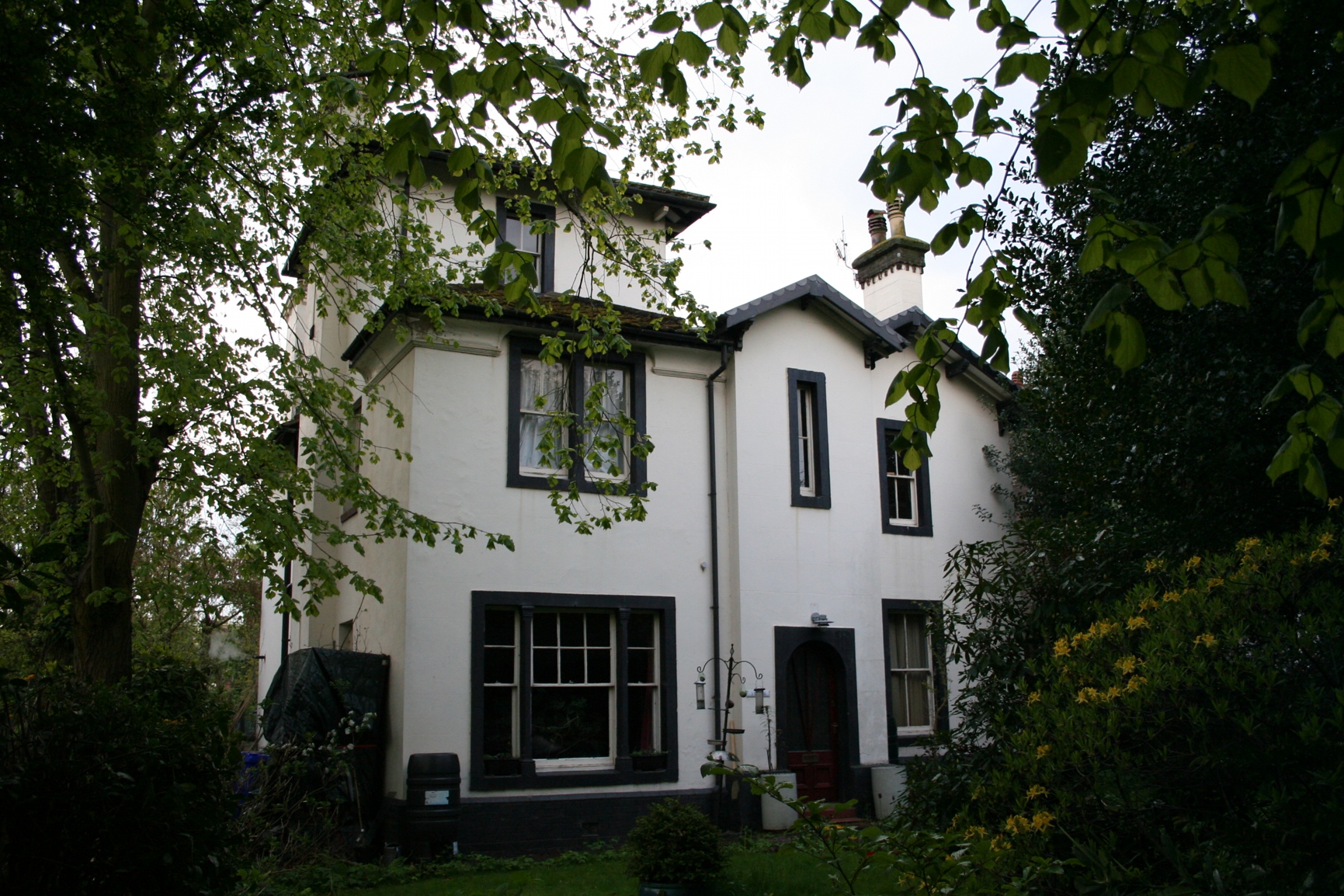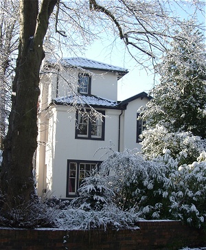 By Charles Lynam. Stucco over brick with concrete tiled roof. Italianate style. 2-storeyed, 3 unequal bays, each with a gable to the main elevation, stepped in plan. Doorway in narrow central bay, and sash windows in outer gables, a tripartite window to ground floor of left-hand bay. Tower to rear. Stack on right-hand gable. Overhanging eaves. The building is about 103M2 set in a garden of 790M2 and constsists of 3 rooms on the ground floor, 5 on the second and one on the third. |